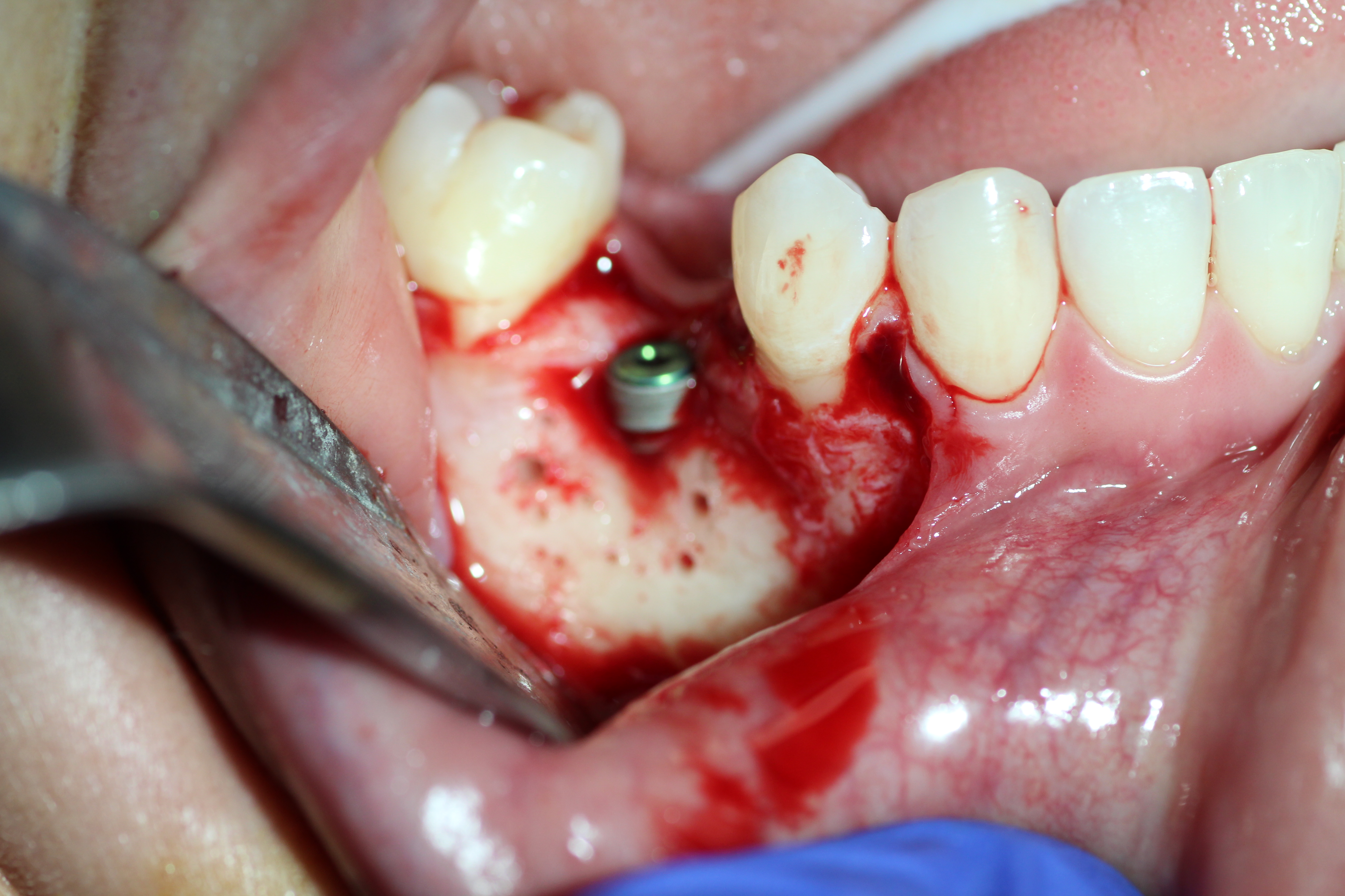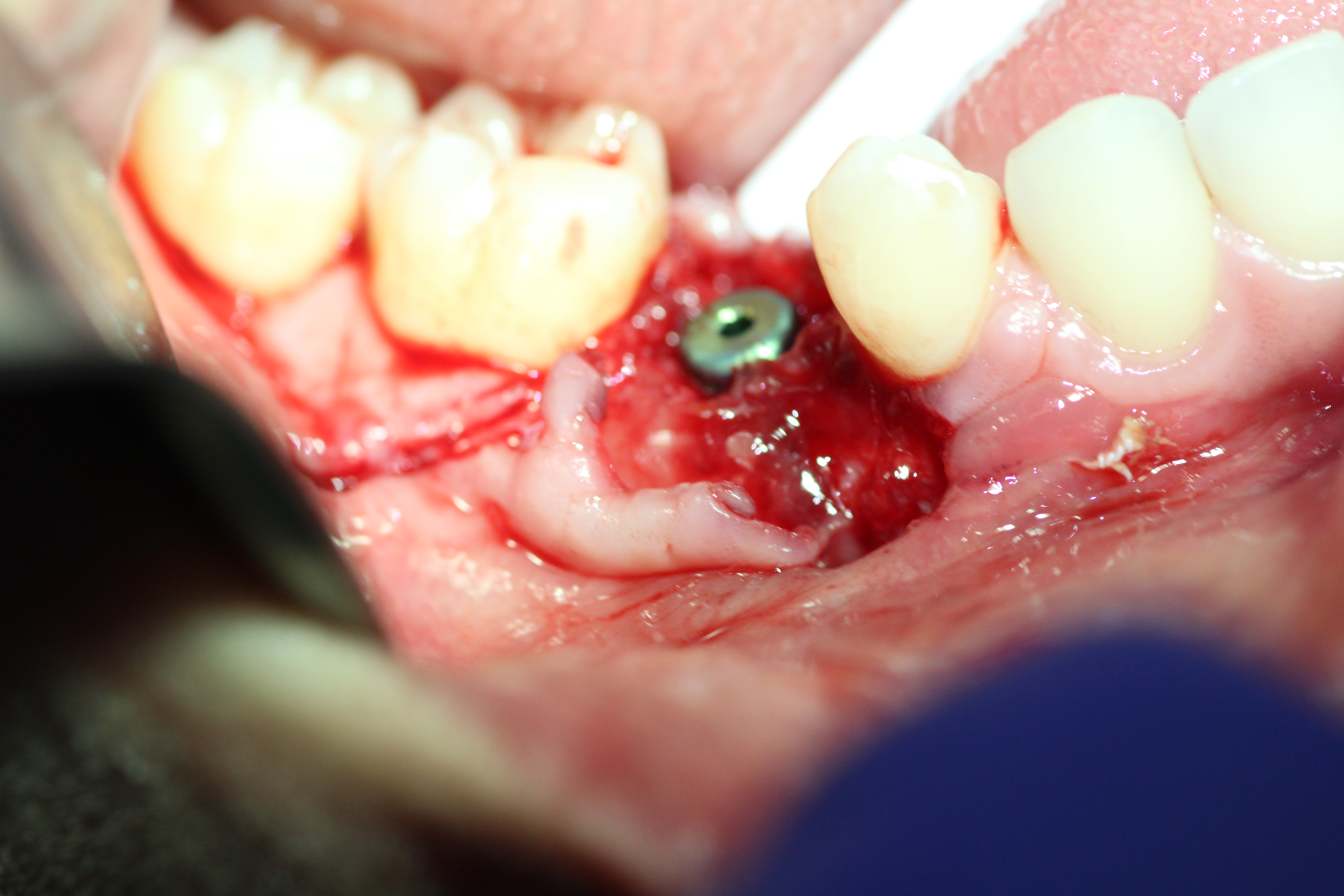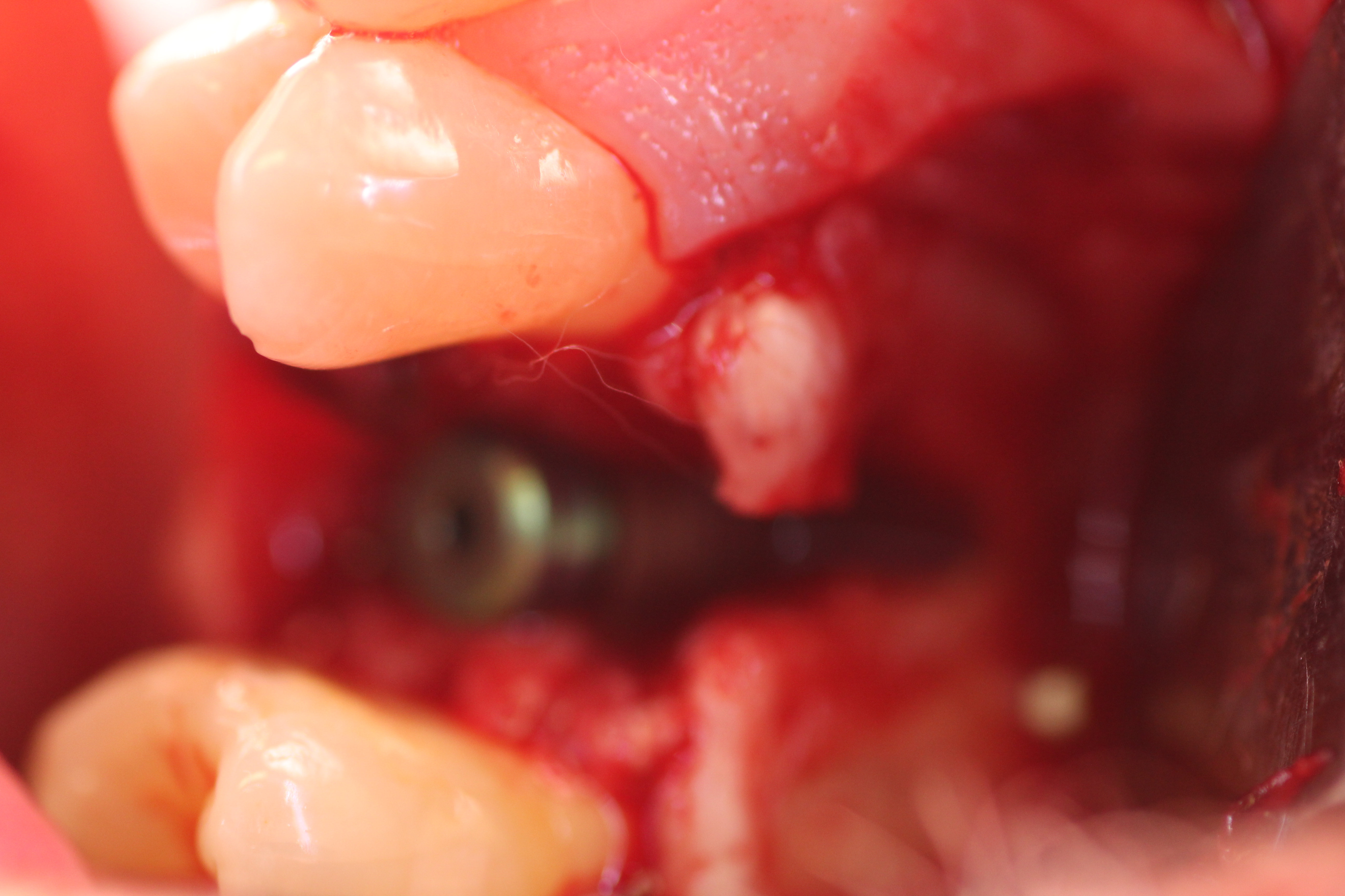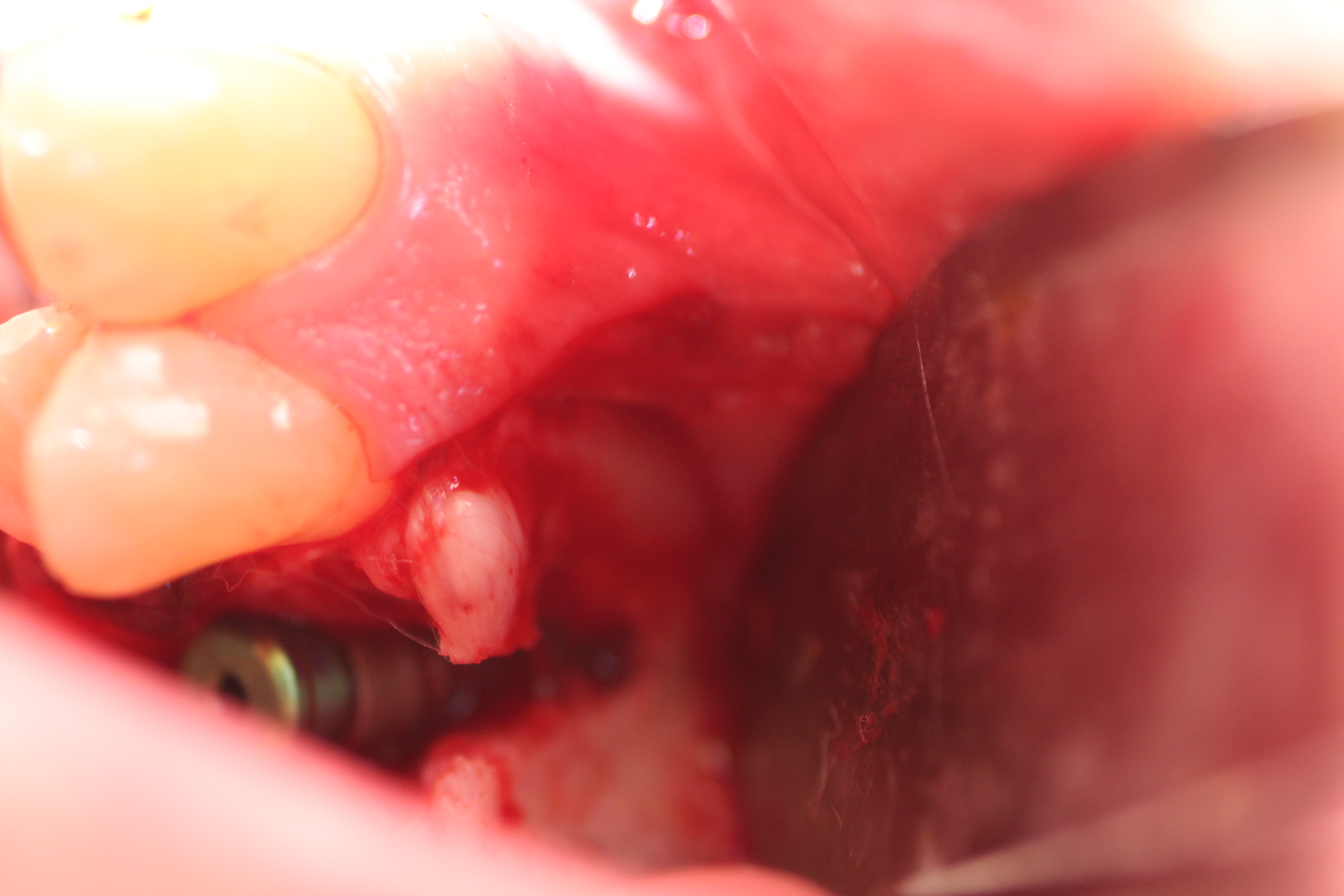 - 2nd stage surgery, membrane removed. Shows nice bulk of buccal bone.