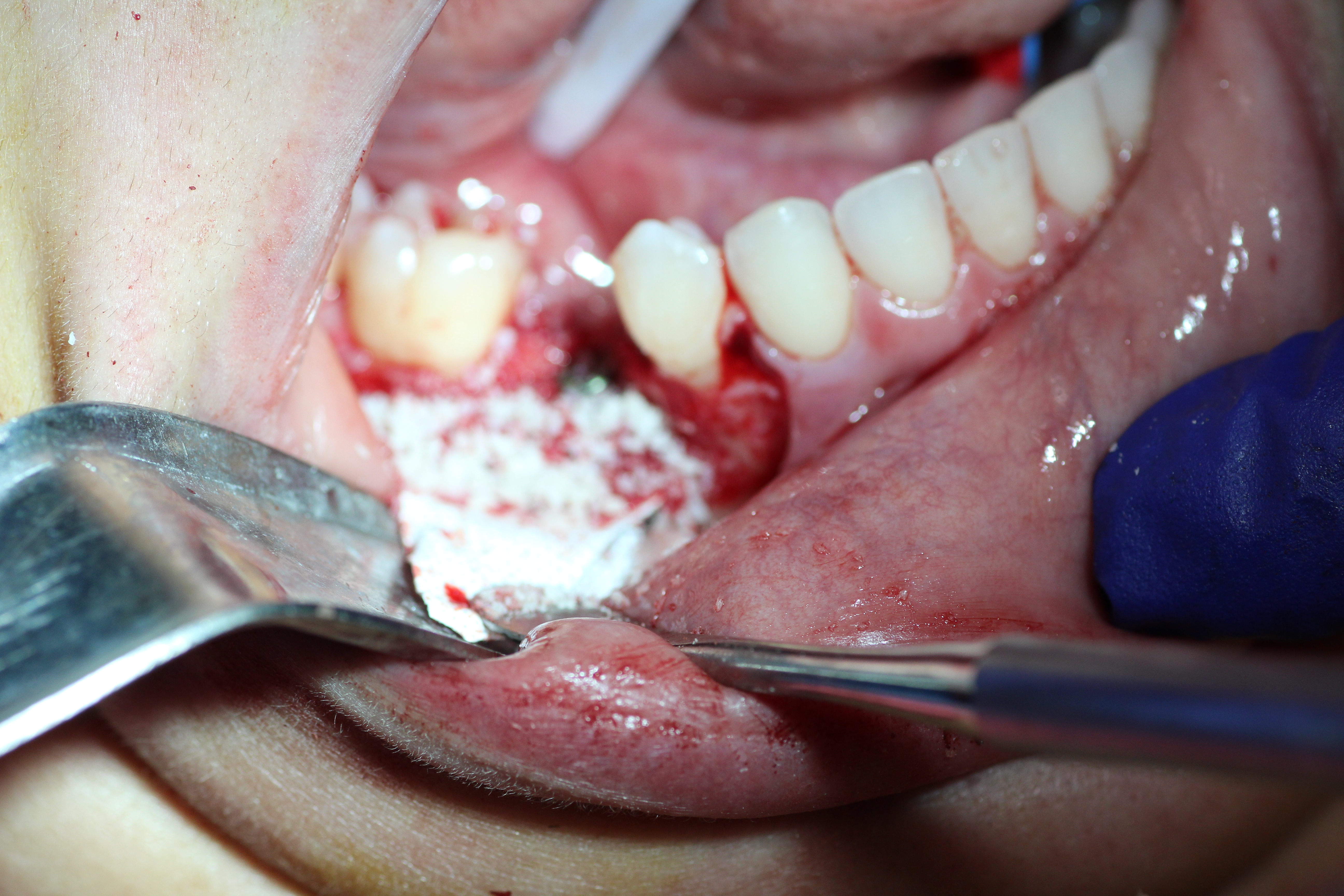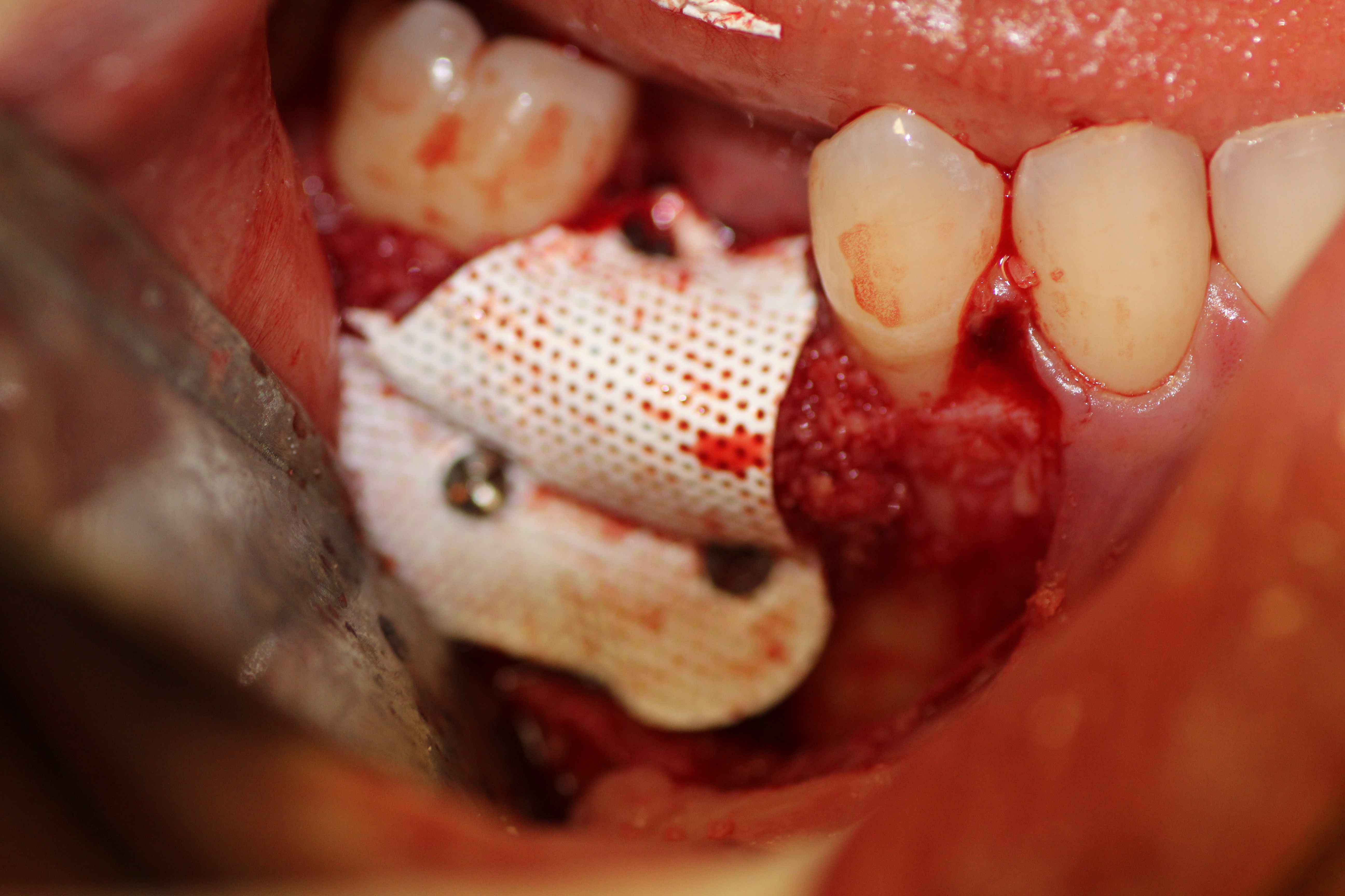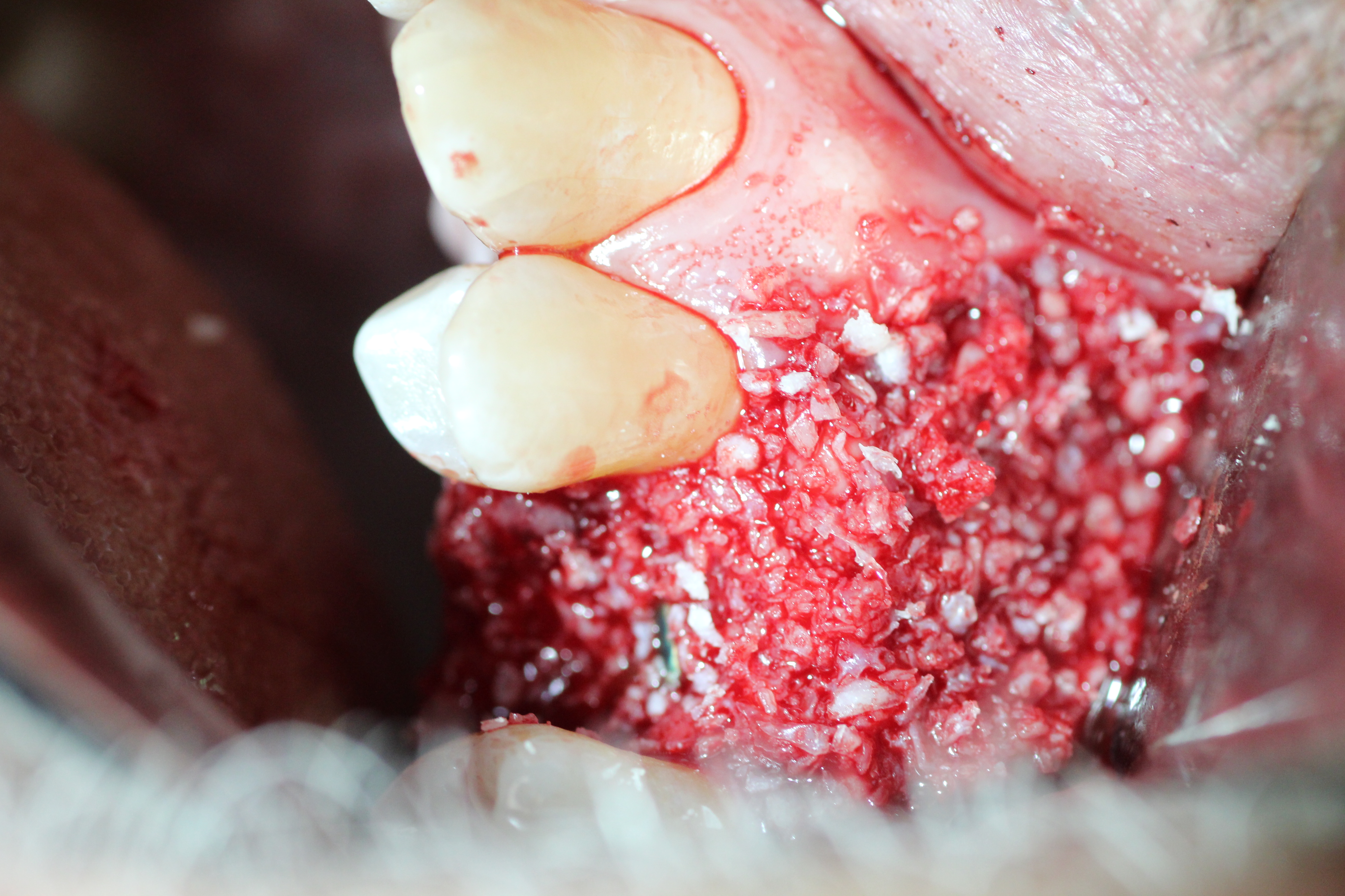 - Human cadaver particulated bonegraft packed into the defect followed by coverage with collagen membrane.